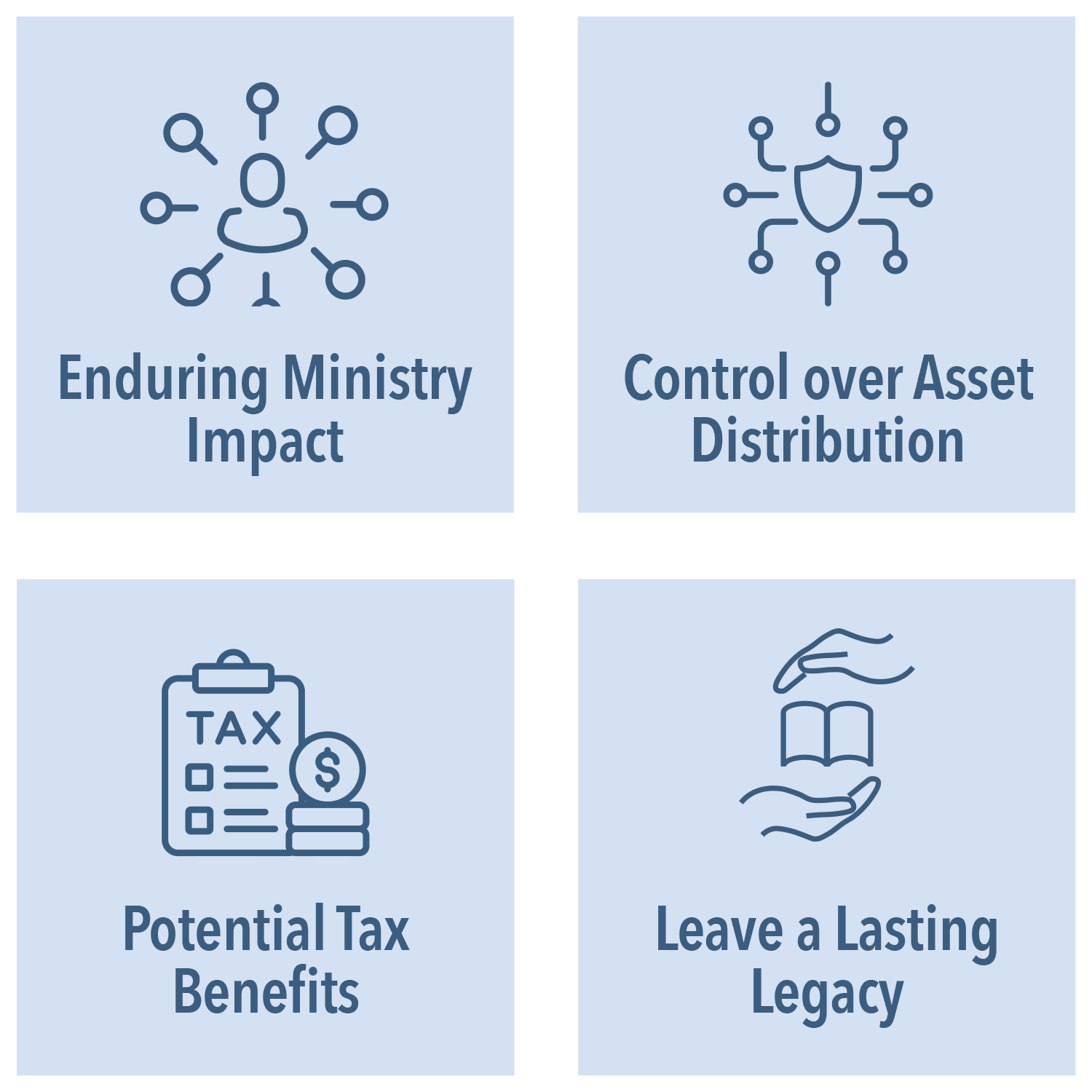 To meet diverse financial needs, the Foundation offers solutions in ministry support, estate planning, tax optimization, income-focused investments, and business succession strategies. With experienced guidance, individuals can navigate giving solution decisions confidently, securing both their future and charitable legacy.